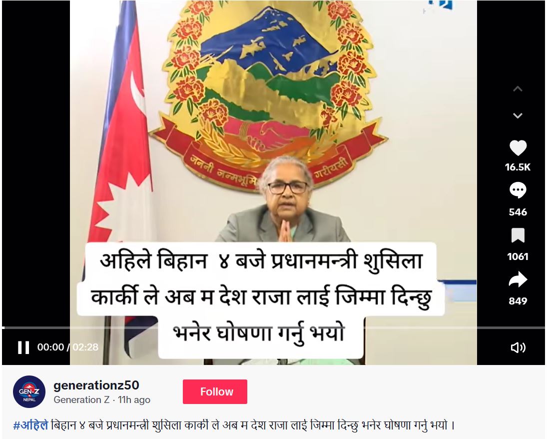 A video allegedly showing Prime Minister Sushila Karki announcing that she will hand over the nation to the king is going viral on TikTok.