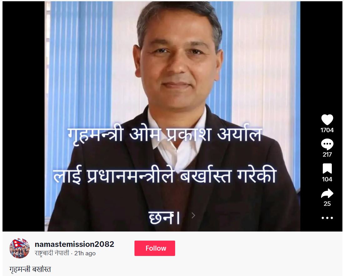 TikTok user @namastemission2082 posted a video carrying a photo of Home Minister Om Prakash Aryal. Text superimposed on the video reads, “Prime Minister [Sushila Karki] has sacked Home Minister Om Prakash Aryal.” Audio accompanying the video says, “The most difficult thing in life is to recognize the people. The nature and relationships between people are never constant.”