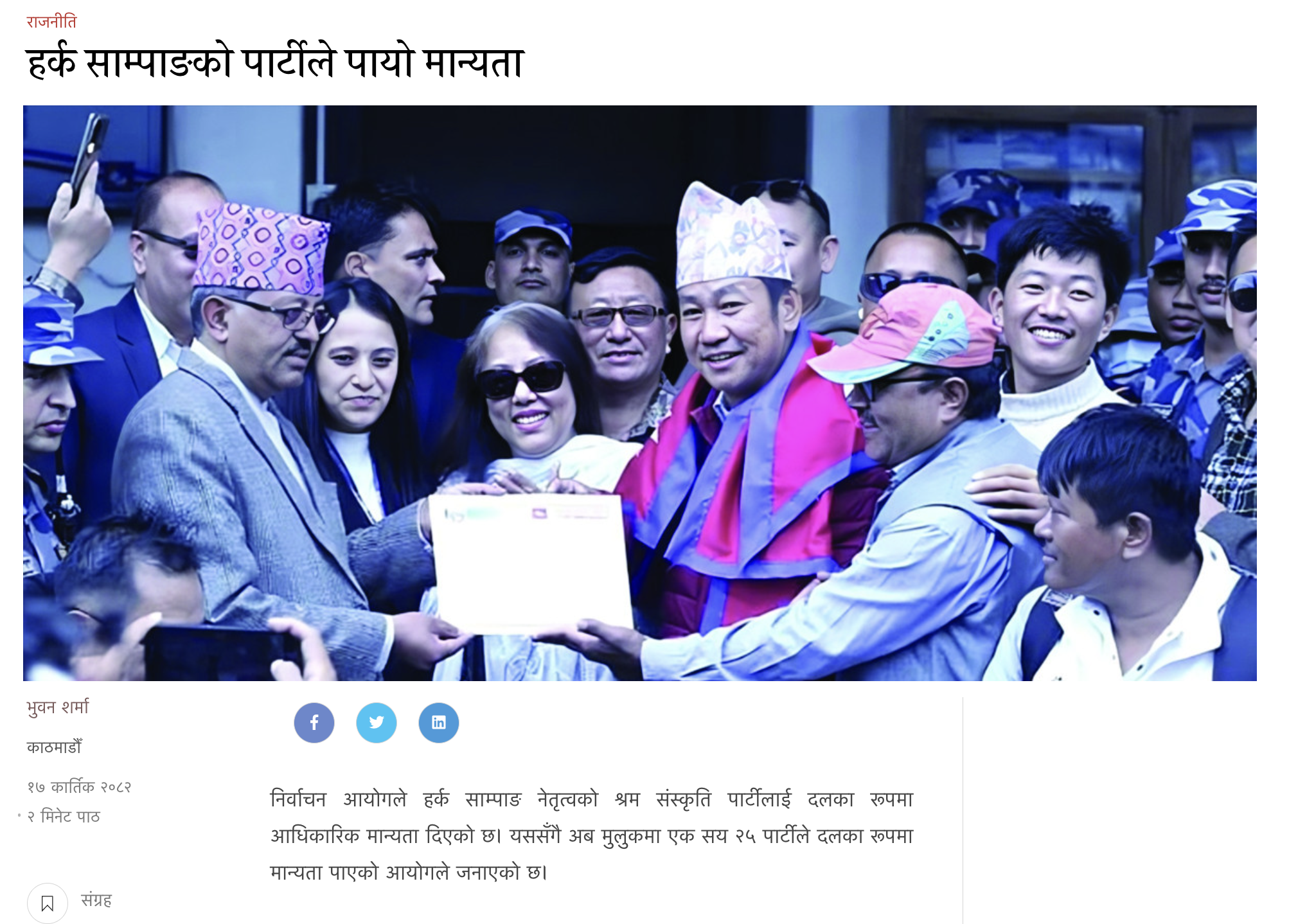 हर्क साम्पाङ नेकपा (एमाले)मा प्रवेश गरेको दाबी गलत छ । दाबीसहित सामाजिक संजालमा फैलाइएको तस्बिर वर्तमान सन्दर्भको होइन, यो चैत्र २०८१ मा धरानको खानेपानी समस्या समाधानका लागि तत्कालीन प्रधानमन्त्री केपी शर्मा ओलीसँग भएको भेटको पुरानो तस्बिर हो । साम्पाङले २०८२ मा ‘श्रम संस्कृति पार्टी’ नामक दल दर्ता गरी, आगामी चुनाव आफ्नै नेतृत्वमा तयारी गरेको प्रमाणित हुन्छ ।
