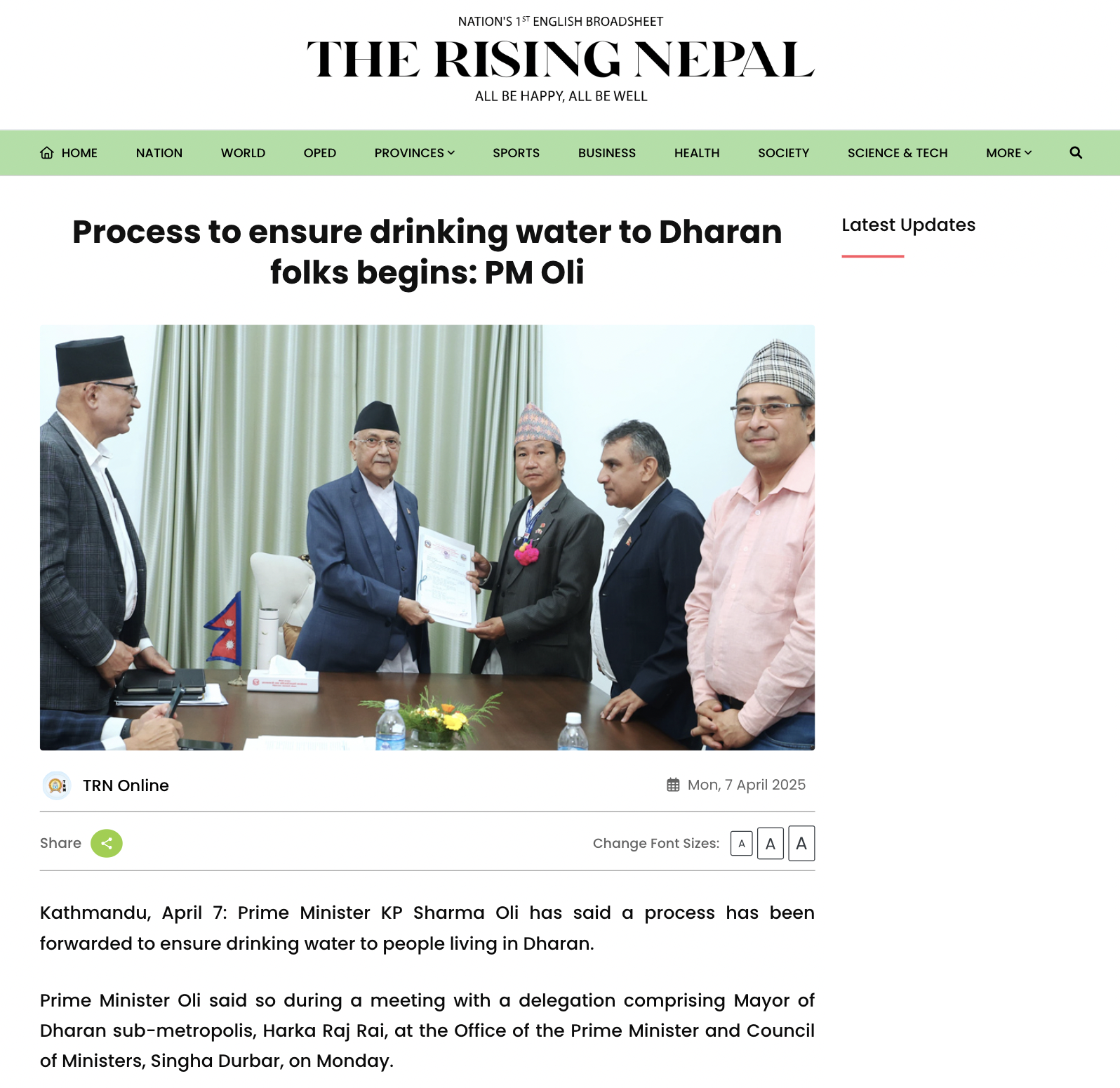 दाबीको जाँचका क्रममा सबैभन्दा पहिले हामीले प्रस्तुत तस्बिरको वास्तविकता पत्ता लगाउने कोशिस गर्यौँ । जाँचका क्रममा सरकारी संचार माध्यम risingnepaldaily.com प्रकाशित समाचार फेला पर्यो । ७ अप्रिल २०२५ मा पोस्ट गरिएको सामाचार अनुसार धरानको खानेपानी समस्या समाधानका लागि मेयर हर्क साम्पाङले तत्कालीन प्रधानमन्त्री केपी शर्मा ओलीसँग भेट गरेका थिए ।