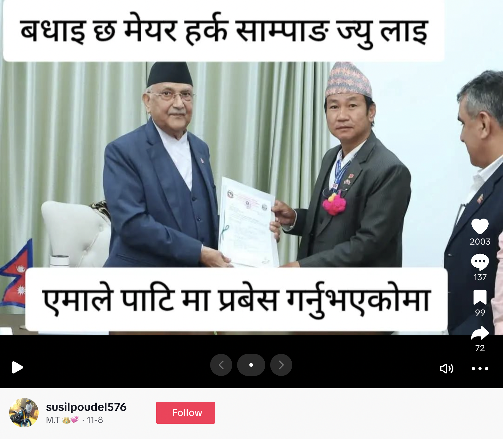 Susilpoudel576 नामक टिकटक आइडीमा पोस्ट गरिएको तस्बिरमा पूर्वप्रधानमन्त्री एवं एमालेका अध्यक्ष केपी शर्मा ओली र मेयर हर्क साम्पाङ देखिएका छन् । तस्बिरको थमनेलमा लेखिएको छ- ‘बधाई छ हर्क साम्पाङ ज्यूलाई, एमाले पार्टीमा प्रवेश गर्नुभएकोमा ।’