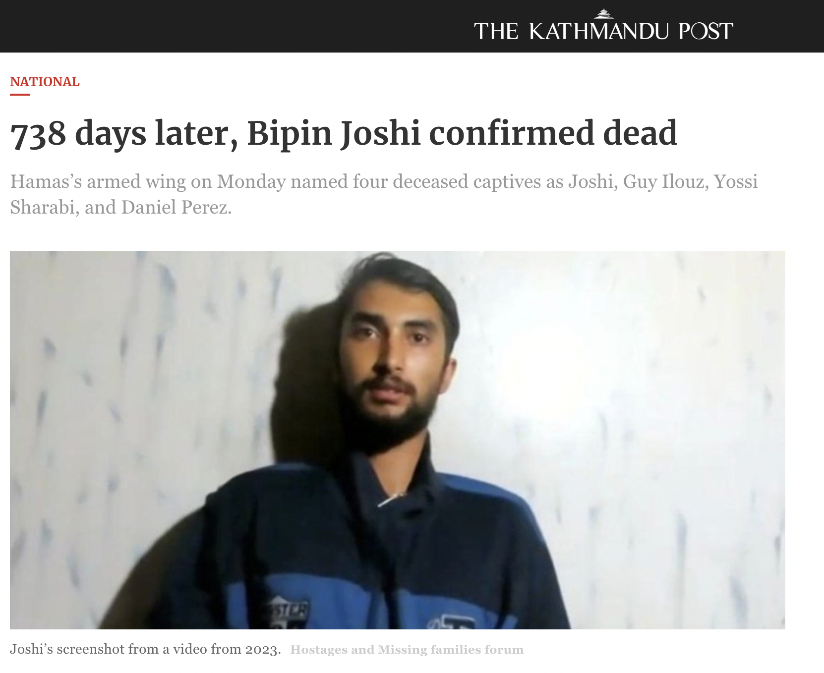 फेला परेका तथ्यहरुबाट के प्रमाणित हुन्छ भने विपिन जोशी जीवितै फर्किएका छैनन् । उनी सन् २०२३ को अक्टोबर ७ को हमास आक्रमणमा अपहरणमा परेका थिए र सन् २०२५ को अक्टोबरमा उनको मृत्यु भएको पुष्टि भएको छ ।
