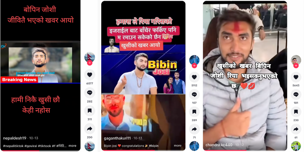 Gaganthakuri11 नामक टिकटक आइडीमा पनि सोही दाबीलाई दोहोर्याइएको छ । भिडियोमा विपिनले अन्तर्वार्ता दिइरहेको सन्देश फैलाइएको छ । साथै भिडियोको थमनेलमा लेखिएको छ- ‘हमासले रिहा गरिसकेको, इजरायलबाट बाँचेर फर्किए पनि म रमाउन सकेको छैन: विपिन’ ।