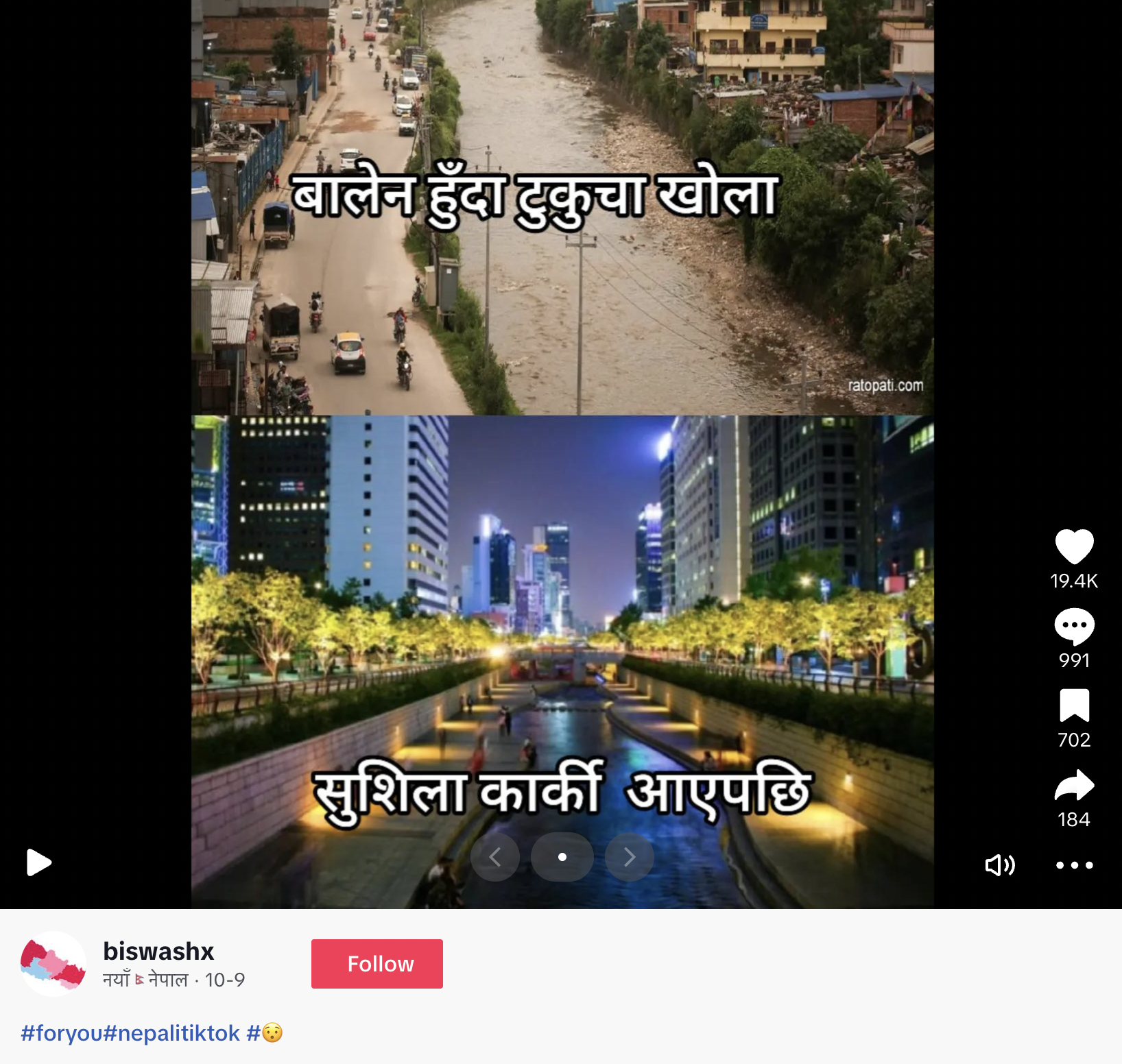 त्यस्तै अर्को पोस्टमा पनि यस्तै दुईवटा तस्बिरसहितको सामग्री देख्न सकिन्छ । टिकटक आइडीमा पोस्ट गरिएका दुई तस्बिरको थमनेलमा लेखिएको छ- ‘बालेन हुँदा टुकुचा खोला, सुशीला कार्की आएपछि ।’