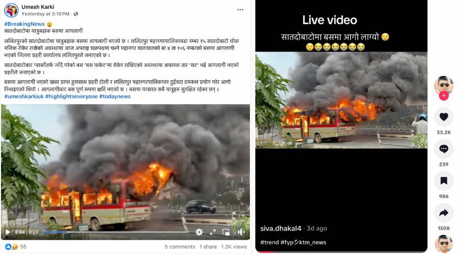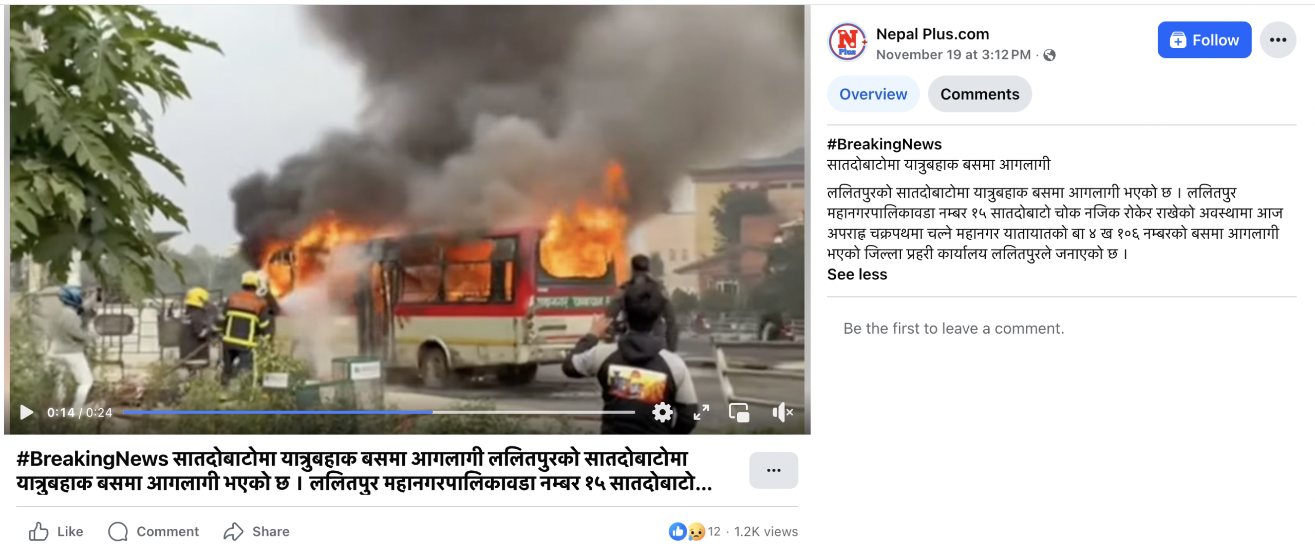 NepalPlus.com र Umesh Karki लगायतका फेसबुक आइडीमा पोस्ट गरिएको भिडियो क्लीपमा सडक छेउको बसमा आगलागी भइरहेको दृश्य देख्न सकिन्छ । १९ नोभेम्बर २०२५ मा पोस्ट गरिएको भिडियोको क्याप्सनमा लेखिएको छ-