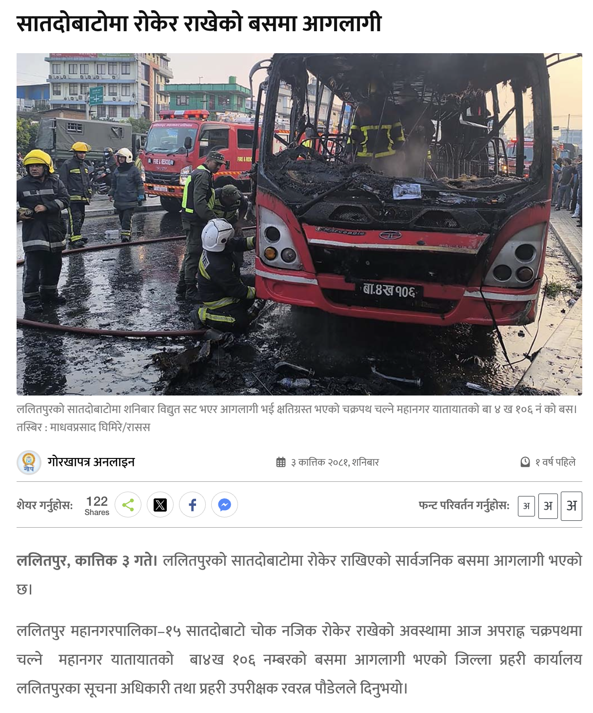 एक वर्षअघि अर्थात् ३ कात्तिक २०८१ मा प्रकाशित समाचारमा ‘ललितपुर महानगरपालिका–१५ सातदोबाटो चोक नजिक रोकेर राखेको अवस्थामा आज अपराह्न चक्रपथमा चल्ने महानगर यातायातको बा ४ ख १०६ नम्बरको बसमा आगलागी भएको’ जानकारी दिइएको छ । समाचार अनुसार सातदोबाटोबाट ग्वार्कोतर्फ जाँदै गरेको बस ‘बस पाकेट’मा रोकेर राखिएको अवस्थामा अचानक तार ‘सट’ भई आगलागी भएको थियो ।