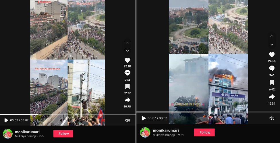 Mukhiya.brandjii नामक टिकटक आइडीमा पोस्ट गरिएको भिडियोमा जेनजी प्रदर्शनका क्रममा खिचिएका दृश्यहरु जोडिएको छ । साथै भिडियोमा दाबीसहितको अडियो पनि जोडिएको छ । उक्त अडियोमा भनिएको छ- ‘अबको एक घन्टापछि नेपालमा बन्द हुँदैछ टिकटक । टिकटक आजैदेखि बन्द हुँदैछ। प्राविधिक तयारीका लागि डेढ घण्टा लाग्नेछ ।’